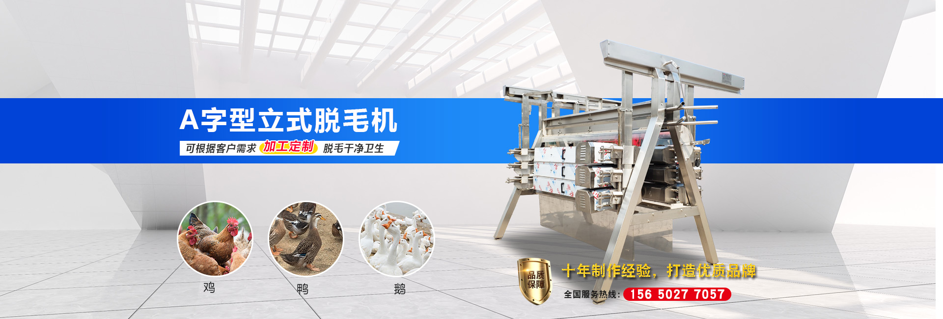 公司長(zhǎng)期與國(guó)內(nèi)外屠宰加工企業(yè)合作,走引進(jìn)——消化——?jiǎng)?chuàng)新和自主研發(fā)相結(jié)合的道路,在國(guó)內(nèi)外同類(lèi)產(chǎn)品的基礎(chǔ)上,不斷更新和改造。公司主要設(shè)備有:A字型立式脫毛機(jī)、臥式脫毛機(jī)、強(qiáng)力噴淋機(jī)、松毛機(jī)、浸燙池、螺旋預(yù)冷機(jī)、禽籠清洗機(jī)、電暈機(jī)、兔扯皮機(jī)、兔割前爪/后爪機(jī)、剝胗機(jī)、自動(dòng)洗鉤機(jī)、螺旋燙爪機(jī)、雞爪脫皮機(jī)、分割輸送帶等屠宰用設(shè)備。其中,公司獨(dú)力發(fā)明生產(chǎn)設(shè)計(jì)的“電動(dòng)調(diào)節(jié)脫毛機(jī)”及“自動(dòng)控水控溫浸燙池”順利通過(guò)知識(shí)產(chǎn)權(quán)局的實(shí)質(zhì)性審查。公司所生產(chǎn)的設(shè)備 可與國(guó)外同類(lèi)產(chǎn)品配套使用,設(shè)備遠(yuǎn)銷(xiāo)阿爾及利亞、澳大利亞等中東、非州等并建立了長(zhǎng)期穩(wěn)定的合作關(guān)系。